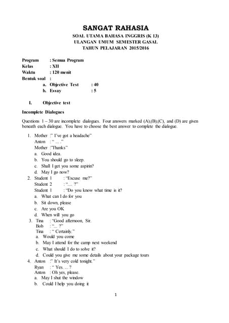 Contoh soal bahasa inggris kelas xii semester 2 beserta jawaban tulisan pertama yang sedang anda baca berisikan materi tentang kinds of expression. Agar kegiatan tersebut berjalan dengan tertib, siswa kelas x dan xi masuk sekolah pukul 10.00 wib. 6 nov 2019 kisi kisi soal penilaian akhir semester 1 bahasa indonesia kelas xii sma ma mata pelajaran bahasa. Xi mia & iis waktu : Norma penilaian pilihan ganda : V0 sin 2α/2g kunci jawaban: Soal bahasa indonesia smk kelas xii dan kunci jawaban 2017. Contoh soal pilihan ganda bahasa indonesia tentang artikel. Soal nomor 1 bola ditendang dengan sudut elevasi α dan kecepatan awalnya v0, bila percepatan gravitasi bumi = g, maka lamanya bola di udara adalah. Tiap jawaban, diberi skor 0 8 jumlah skor maximal 40 nilai : Kesatuan aksi mahasiswa indonesia (kami). Baca juga, materi yang sama dalam bentuk essay/uraian: Semoga dapat berguna bagi kamu.