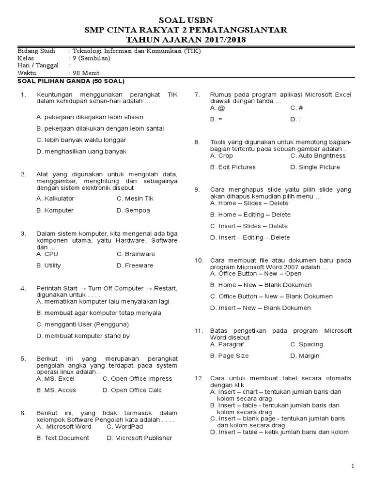 Semakin banyak soal yang diselesaikan oleh peserta didik, maka mereka bisa semakin paham jenis sekaligus model soal. Usbn smp terdiri dari 10+ mata pelajaran yang terdiri dari matematika bahasa indonesia, bahasa inggris, pendidikan agama islam, ilmu pengetahuan alam (ipa), ilmu pengetahuan sosial (ips), tik, pjok, prakarya, seni budaya, dll. Soal usbn smp 2019/2020 merupakan salah satu bagian penting try out dan dapat dijadikan referensi latihan untuk hasil usbn smp yang maksimal. Kumpulan soal tik kelas 7 beserta jawaban. Saya tidak akan mengutip semuanya secara langsung.
